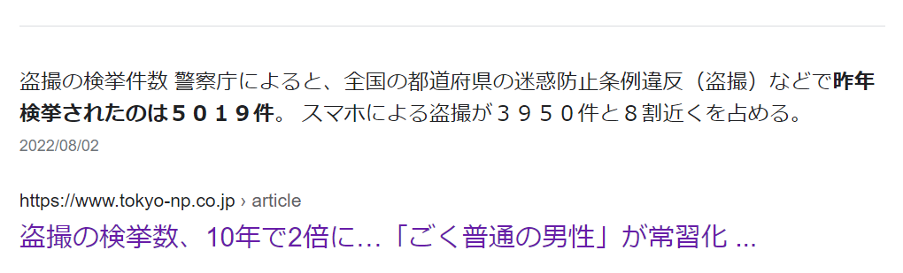 また盗撮を実行に移してはいないものの、1歩間違えば盗撮に手を伸ばしてもおかしくないというぐらいヤバイやつはその10倍~20倍ぐらいはいるだろうということです。