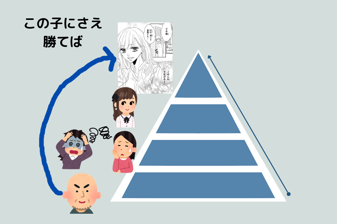 「おかしい。俺の計画によるとマウントを取ることで上に立てるはずなのに、なんで上手くいかないんだよ!」とイライライライラしつづけるわけです。